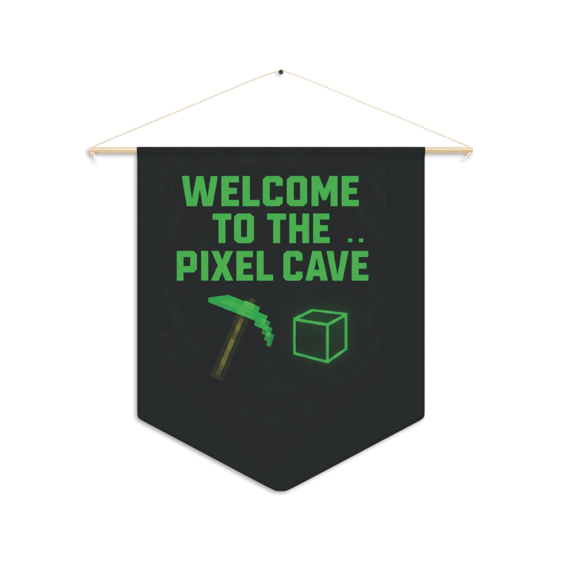 Featuring the phrase “WELCOME TO THE PIXEL CAVE” in glowing block letters, plus a pixel-style pickaxe and cube, this banner channels classic pixel-world adventure vibes — without using any copyrighted imagery. Perfect for fans of sandbox, building, or adventure games who want to show off their love for creativity and gaming culture.